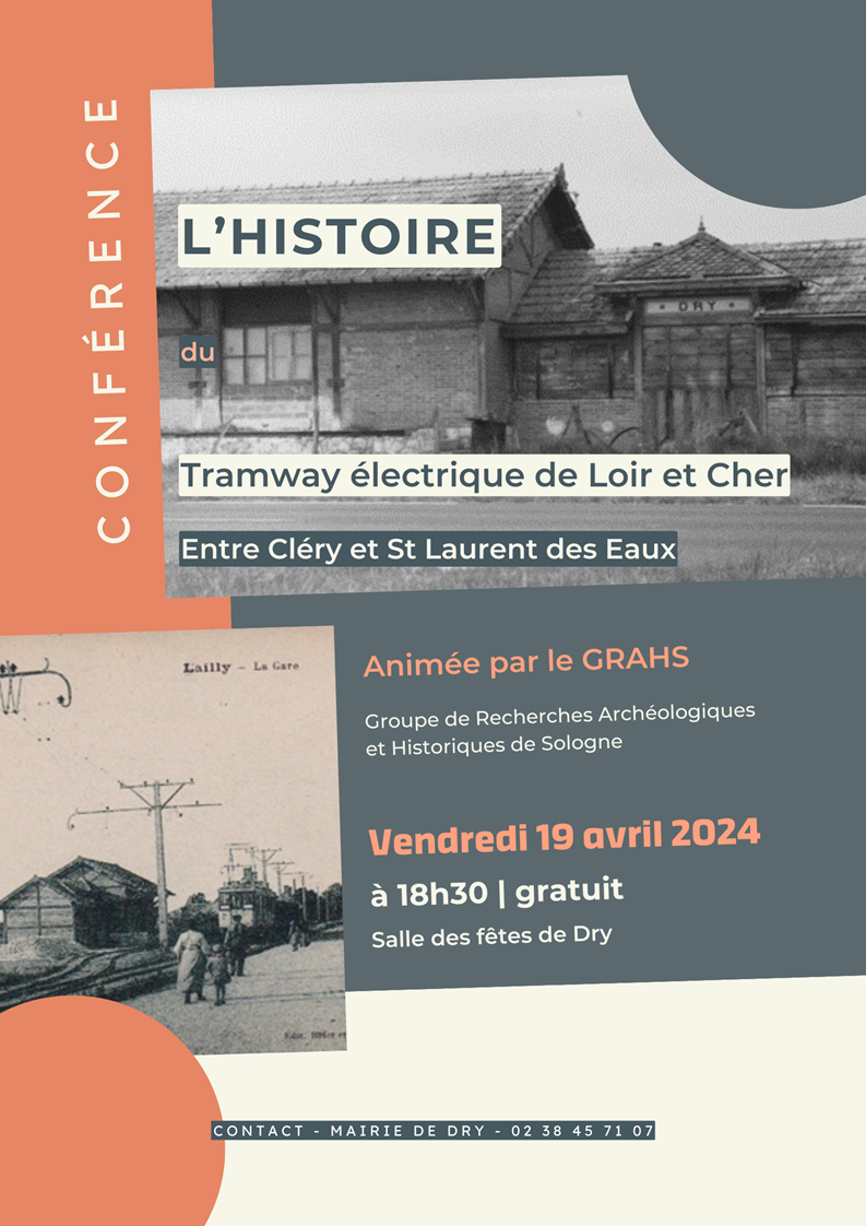 "Quand le tacot passait à Dry" L’histoire du Tramway éléctrique de Loir-et-Cher entre Cléry et Saint Laurent-des-Eaux vendredi 19 avril 2024 à 18 h 30 à Dry jeudi 4 avril 2024