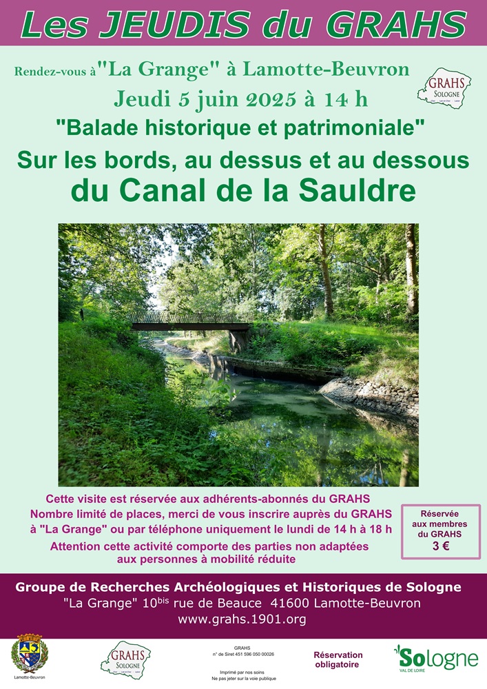 jeudi 5 juin 2025 à 14 h en Sologne « Balade historique et patrimoniale » « Sur les bords, au dessus et au dessous du Canal de la Sauldre » réservée aux membres du GRAHS, sur inscription mercredi 21 mai 2025